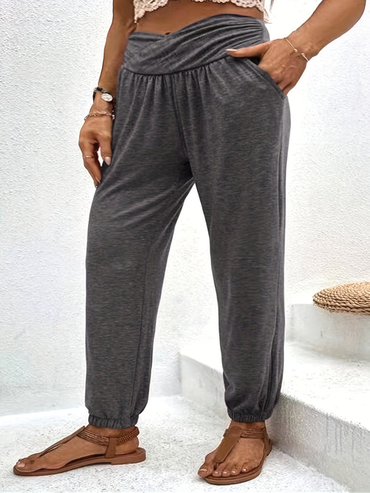 Plus Size Sporty Pants, Women's Plus Solid Tummy Control Slight Stretch Jogger Trousers With Pockets