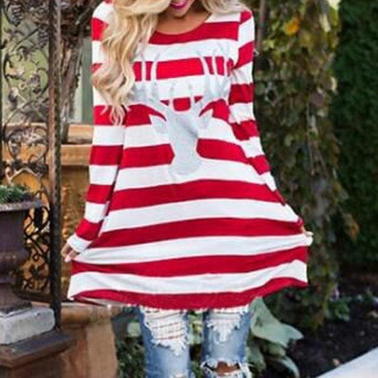 Women Fashion Stripe Dress Round Collar Christmas Elk Long Sleeve Casual Dress family dress mom girl fashion dress ship from USA