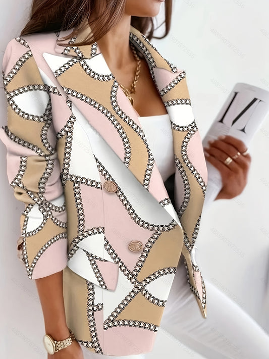 Plus Size Elegant Blazer, Women's Plus Chain Print Double Breasted Lapel Collar Long Sleeve Blazer