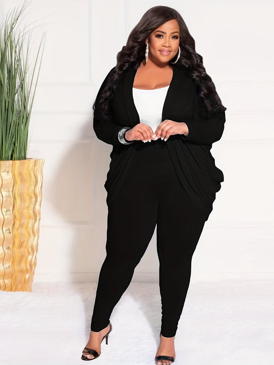 Plus Size Casual Outfits Two Piece Set, Women's Plus Solid Side Ruched Long Sleeve Open Front Cardigan & Skinny Pant Outfits Two Piece Set