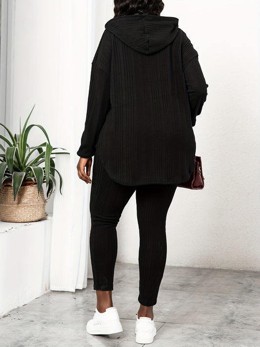 Plus Size Rib Knit Solid Long Sleeve Hoodie Tops & Leggings Set, Women's Plus High Stretch Casual 2pcs Set Co-ords