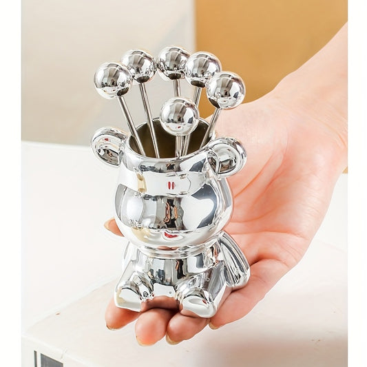 Set, Nordic Light Luxury Fruit Fork Bear Set, Household Stainless Steel Fruit Fork, High Value Storage Bear, Party Supplies, Birthday Day Gift, Birthday Day Decor, Party Supplies, Party Decor, Table Decor, Kitchen Decor, Dessert Decor