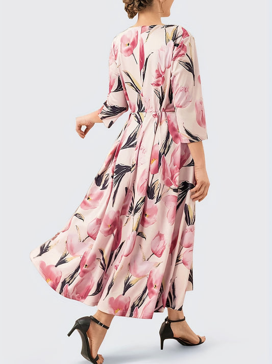 Plus Size Casual Dress, Women's Plus Floral Print Half Sleeve Square Neck Medium Stretch Maxi Dress