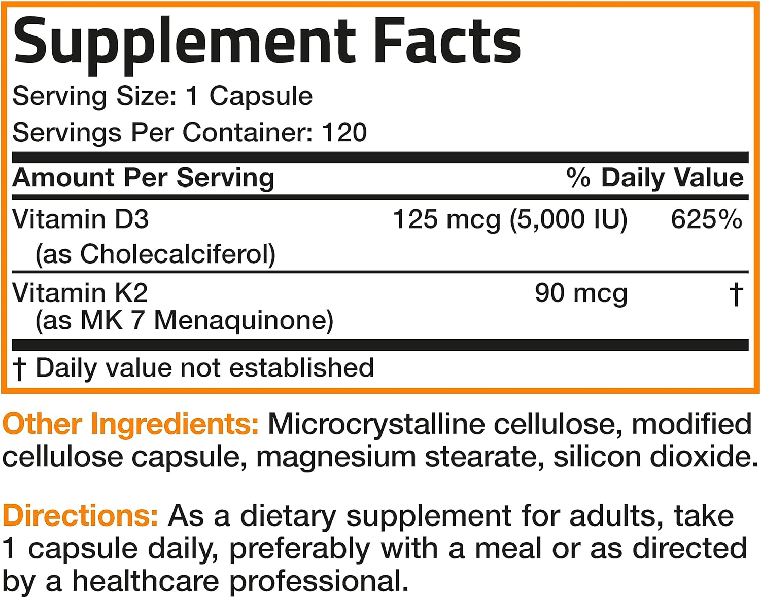 Bronson Vitamin K2 (MK7) with D3 Supplement Non-GMO Formula 5000 IU Vitamin D3 & 90 mcg Vitamin K2 MK-7 Easy to Swallow Vitamin D & K Complex, 120 Capsules